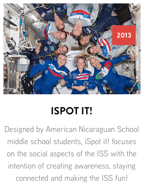 I found myself needing inspiration and found it when my eldest son Andrew Slick, an eighth grader at the time, and his friends at the American Nicaraguan School, agreed to participate with me. We created an iOS app called iSpot it! that created awareness about the ISS. This project representing Managua, Nicaragua, received a Global “Honorable Mention for “Most Inspiring.”